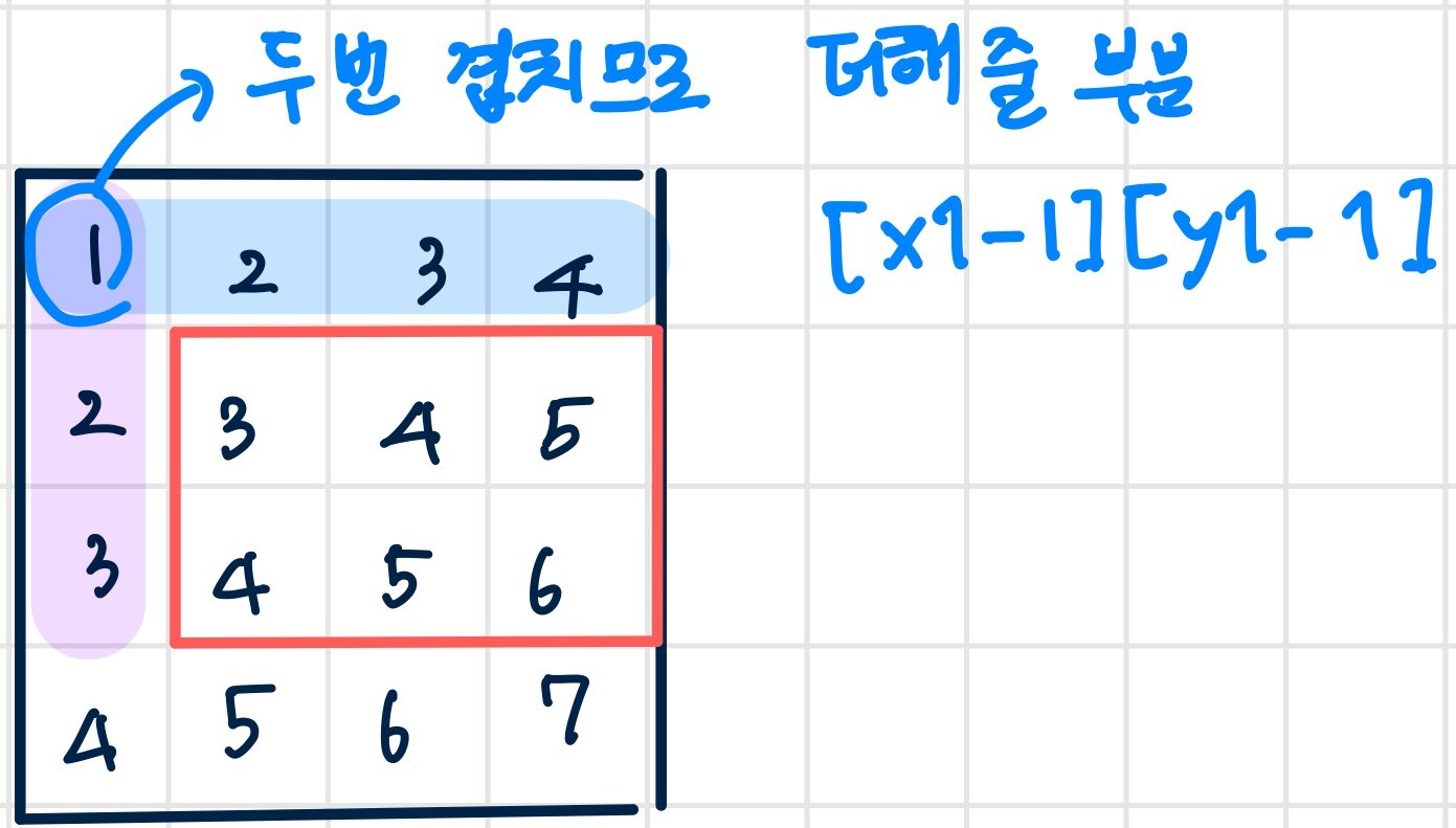 (1,1) ~ (x1 y1-1) 파란색 구간 : array[x2][y1-1]