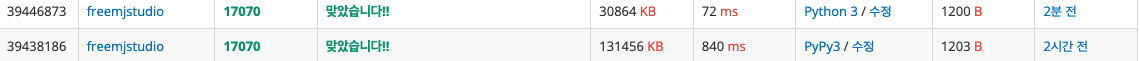 사진에서 위에 있는것이 DP로 풀었을 때, 아래있는 것이 DFS로 풀었을 때이다