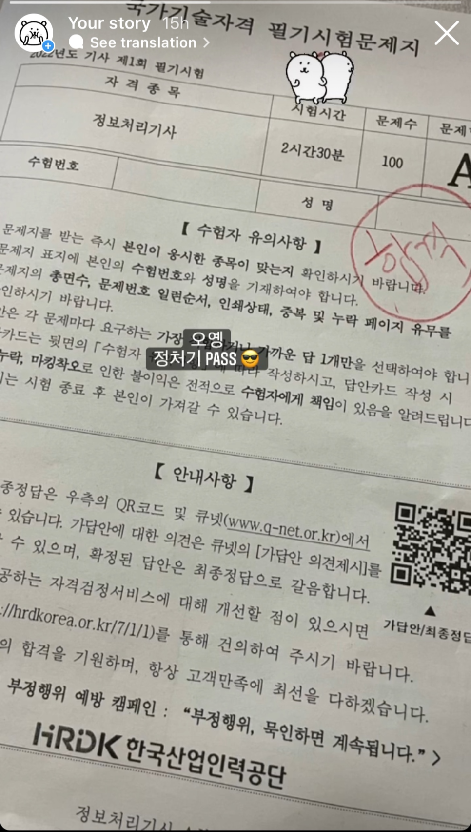 정보처리기사 시험은 본 다음에 큐넷 홈페이지에서 당일 오후에 답이 공개 되어 미리 채점을 해 볼 수 있습니다 !!