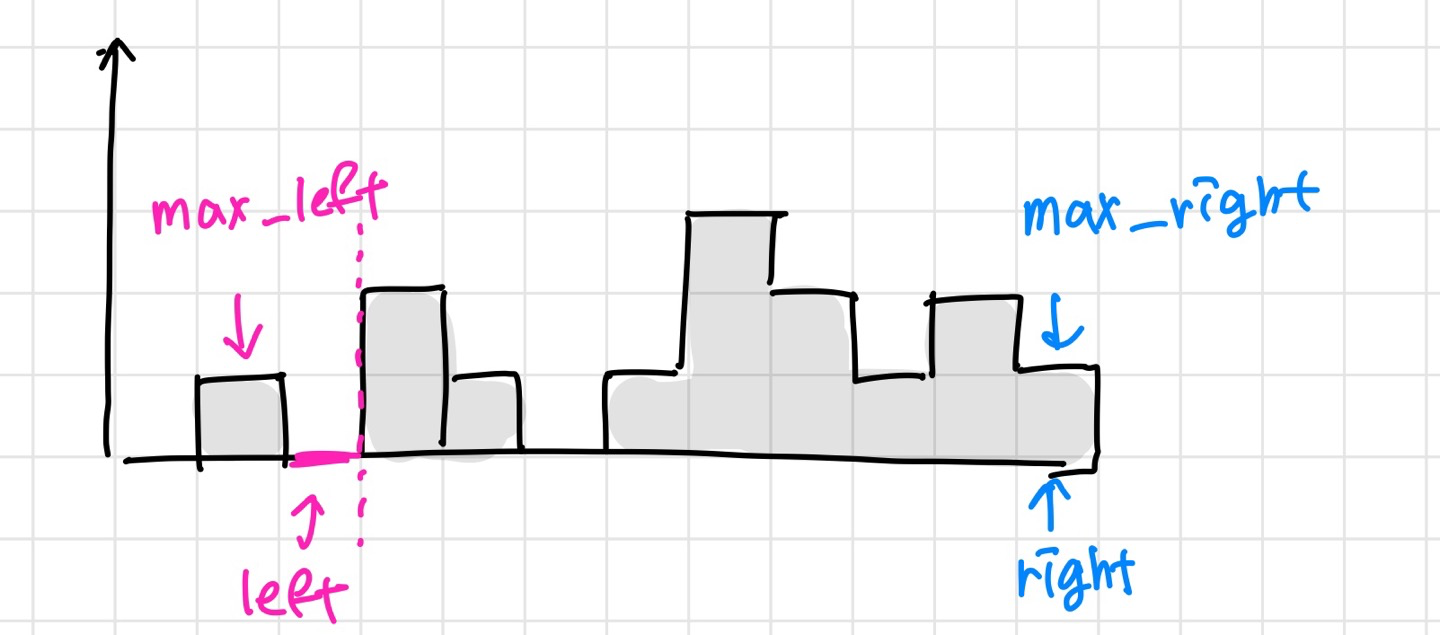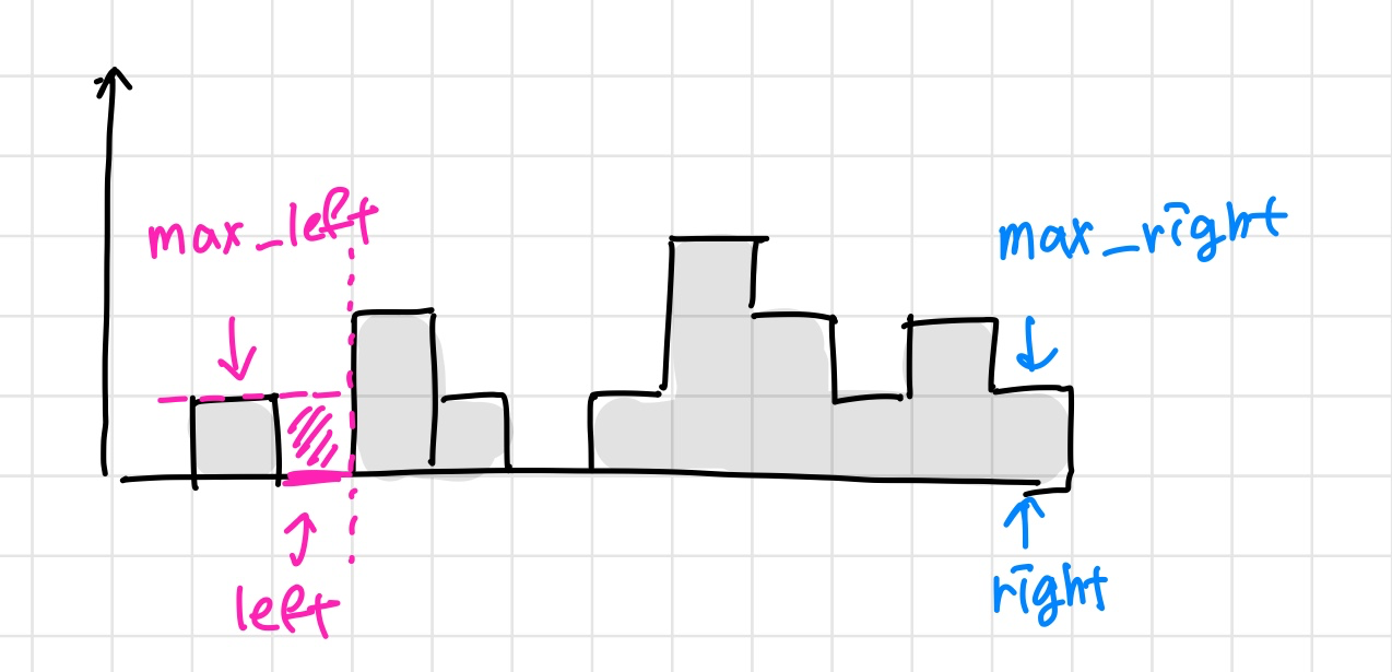 따라서 max_left - height[left] 는 지금까지 중에서의 최대 높이와 현재 가리키는 지점의 높이 차이를 의미하며 핑크색으로 칠해진 빗물이 쌓이는 volume에 대한 값을 구할 수 있다