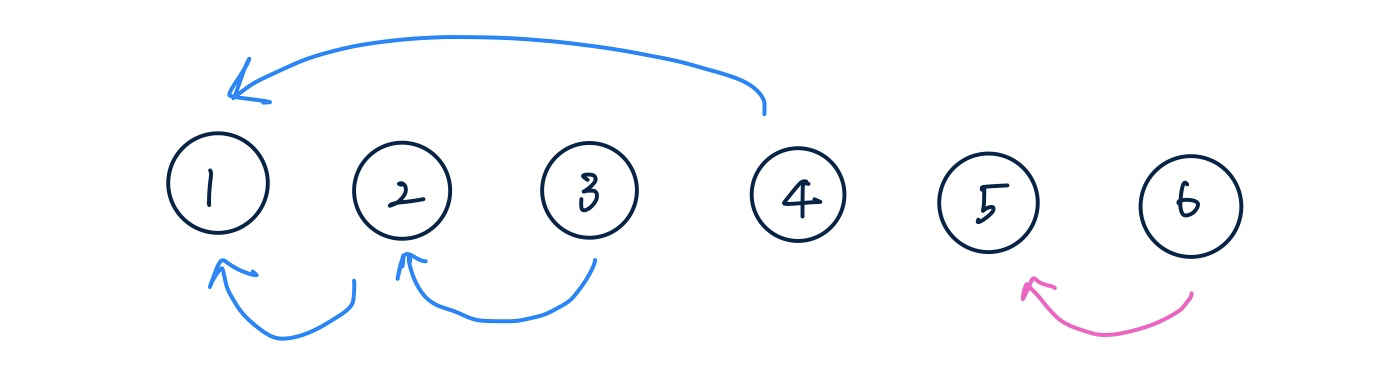특정 원소가 속한 집합을 찾으려면 루트노드를 확인하면 됩니다 예를 들어서 위의 예시에서는 4가 속한 집합은 루트노드가 1인 파란 선들의 집합이고, 6이 속한 집합은 루트노드가 5인 핑크색 집합이 되겠습니다.