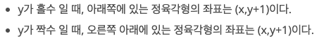 정육각형이므로 총 6방향만 탐색할 수 있고, 탐색가능한 방향은 문제에서 짝수일때와 홀수일때 다르다고 힌트를 주고 있다.