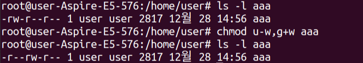 ๋ น์ด๋ aaa ๋ผ๋ ํ์ผ์ ๋ํด user์๊ฒ์ write ๊ถํ์ ์ทจ์ํ๊ณ , group์๊ฒ write๊ถํ์ ๋ถ์ฌํ๋ค๋ ์๋ฏธ์ด๋ค.