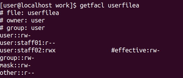 [user@localhost work]$ setfacl -m u:staff02:rwx userfilea [user@localhost work]$ getfacl userfilea