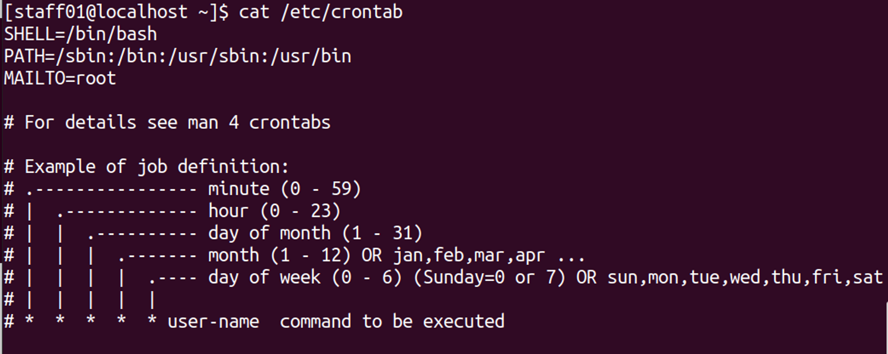 /etc/crontab ์ ๋ด์ฉ์ ๋ค์๊ณผ ๊ฐ๋ค. ์ฌ๊ธฐ์ ์ ๊ณตํ๋ ํ ํ๋ฆฟ์ ์ด์ฉํ์ฌ ์์คํ ์์ ์ ์ค์ผ์ค๋งํ์.