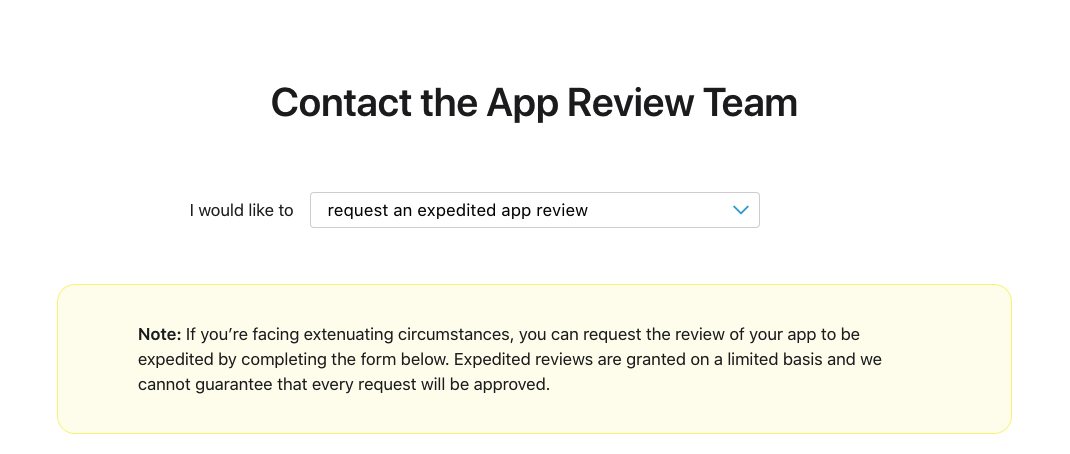 https://developer.apple.com/contact/app-store/?topic=expedite 에서 애플 앱 리뷰 팀에 빠른 리뷰를 신청하고, 앱 정보와 왜 빠른 리뷰를 신청하는지에 대해 간단히 입력 후 문의하면 성공 !