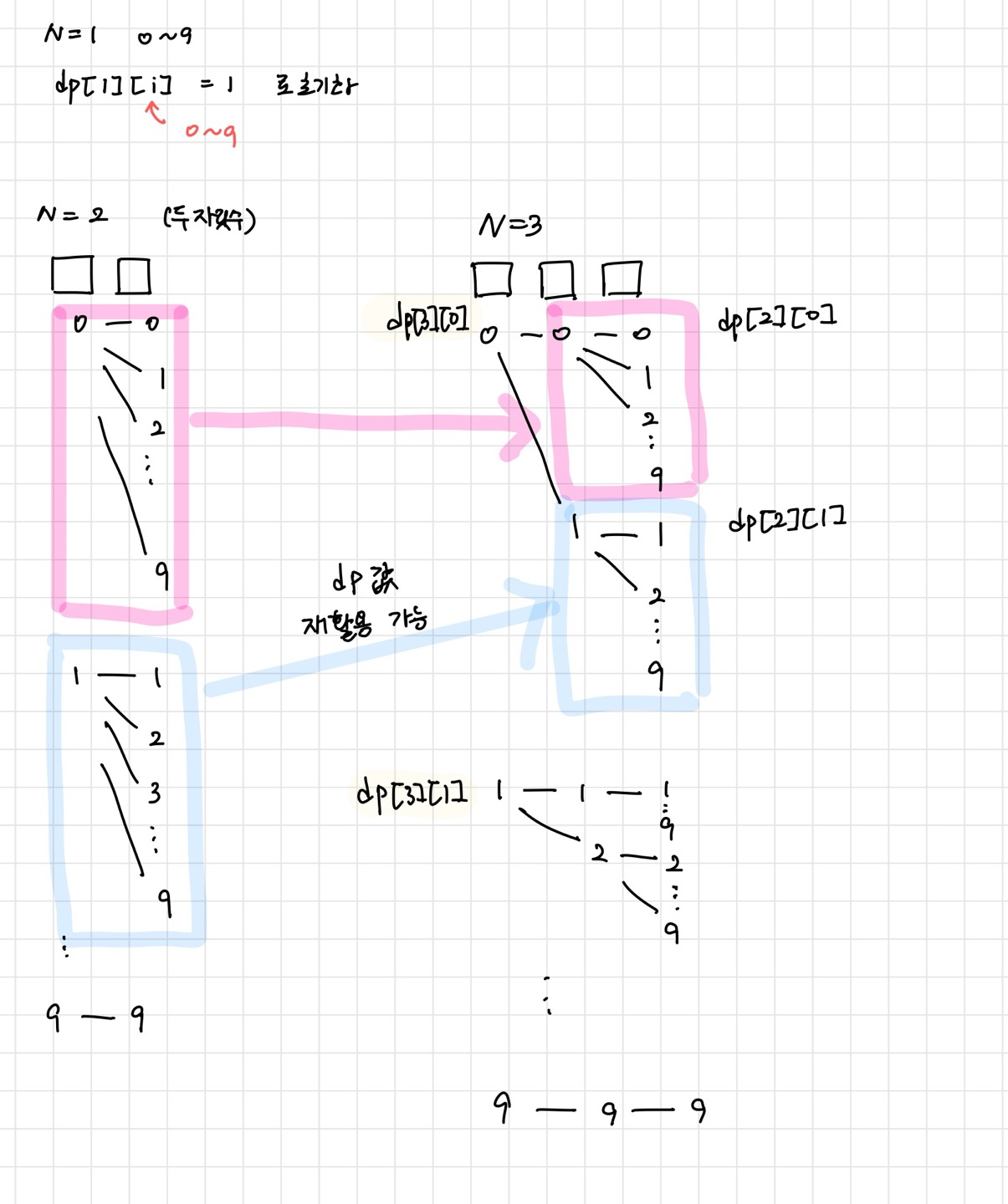 여기서 i 는 자릿수, j 는 시작하는 숫자, k 는 j 다음에 오는 숫자들이 된다.