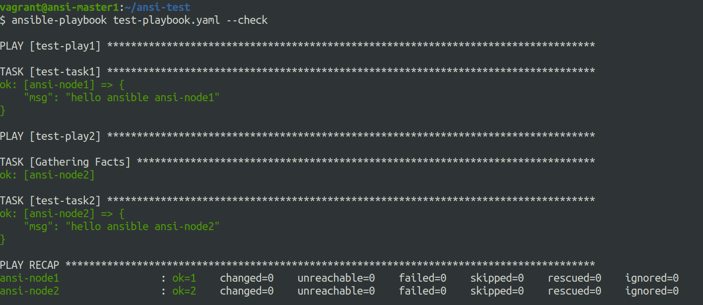 시뮬레이션을 해볼 수 있다. 그러나 주의할점은 순차적으로 작업되어야 하는 경우 play들이 올바르게 정의되었음에도 불구하고 에러가 날 수 있다. 따라서 check 명령어를 100% 믿고 의존하면 안된다