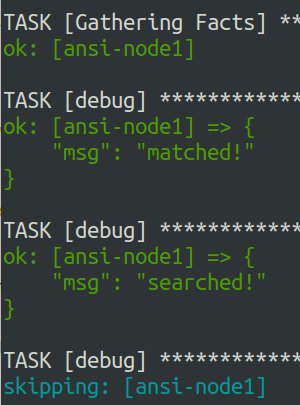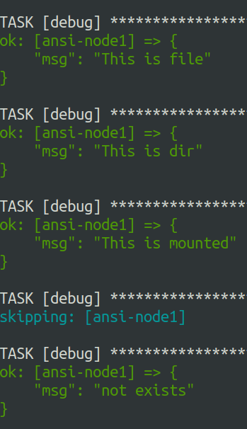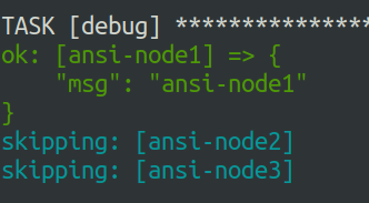 현재 DD 그룹에는 ansi-node1, ansi-node2, ansi-node3 이 있다. 위의 조건문에 따라 hostname이 ansi-node1 인 경우에만 메세지를 출력한다.