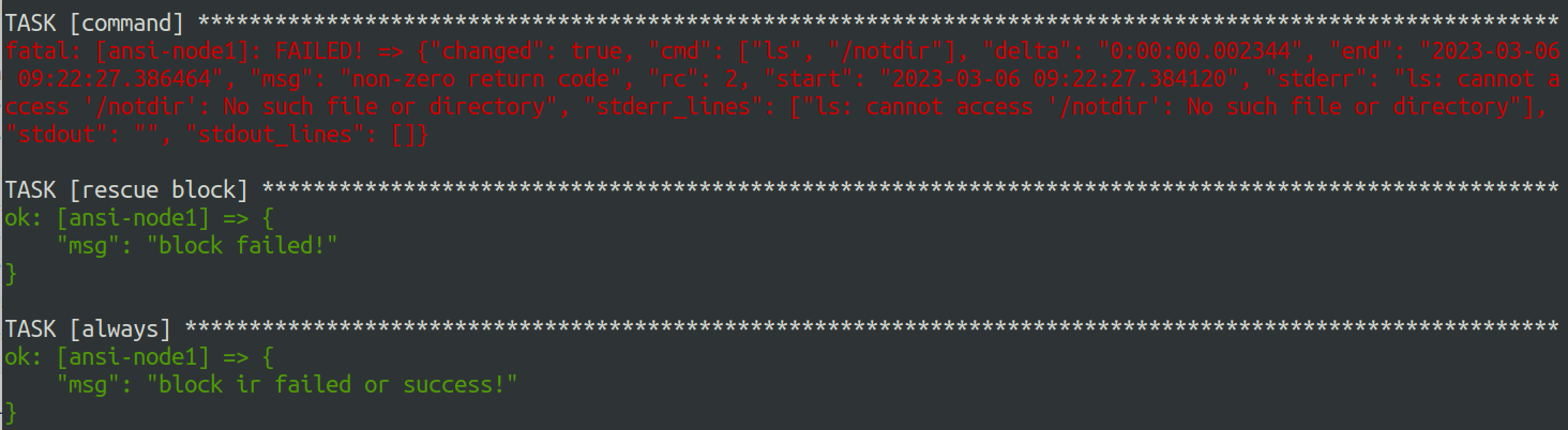 Block 내의 작업이 하나라도 실패하게 되면 rescue 를 실행할 수 있다. 반면, always는 실패 유무와 관련없이 항상 수행하는 작업이다.