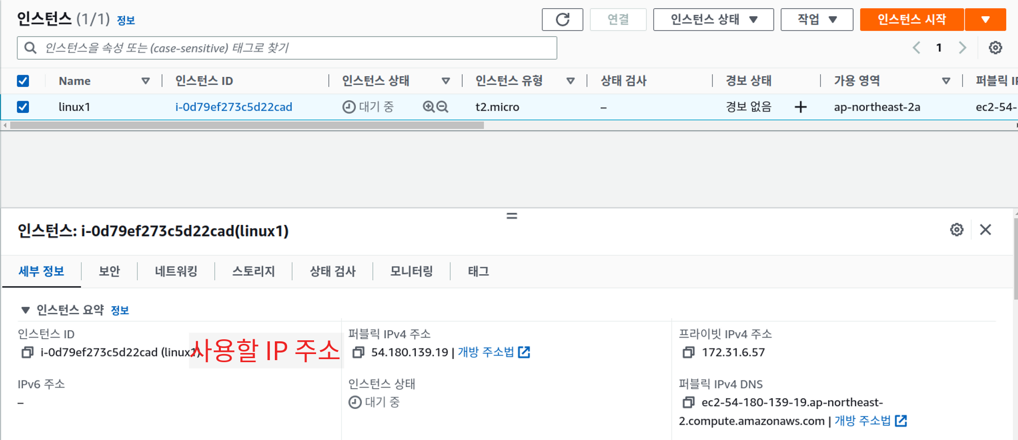 Public IP 주소는 대시보드에서 확인할 수 있다.
