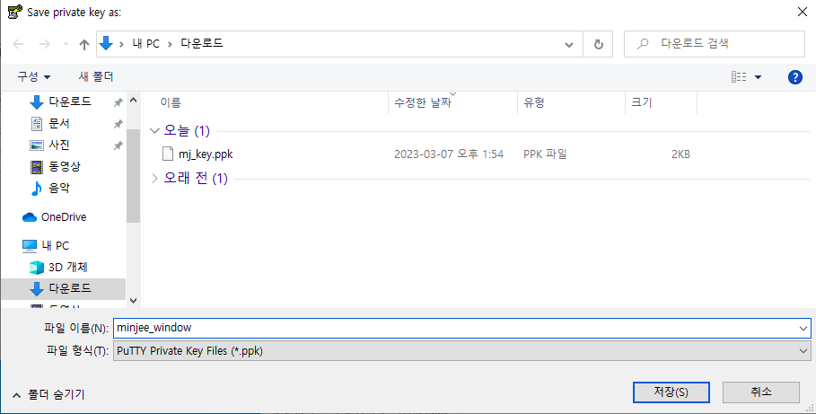 Save Private key 선택 후, 저장할 경로와 이름을 정해주면 .ppk 형식으로 저장된다.
