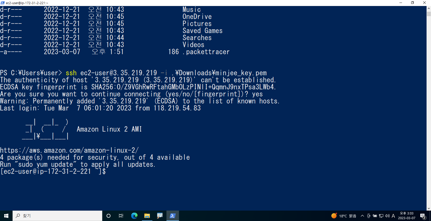 ssh ec2-user@Public IP 주소 -i .\Downloads\minjee_key.pem