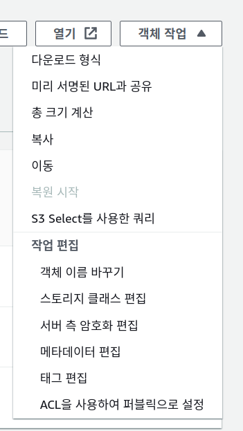 즉, 파일 권한 접근이 없다는 것이다. 따라서 객체 작업을 선택후, ACL 을 사용하여 퍼블릭으로 설정을 누른다.