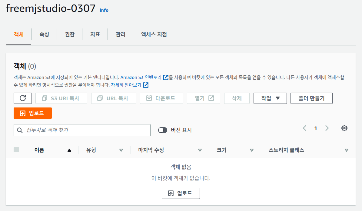 해당 버킷으로 이동한 후 폴더를 생성하기로 한다.