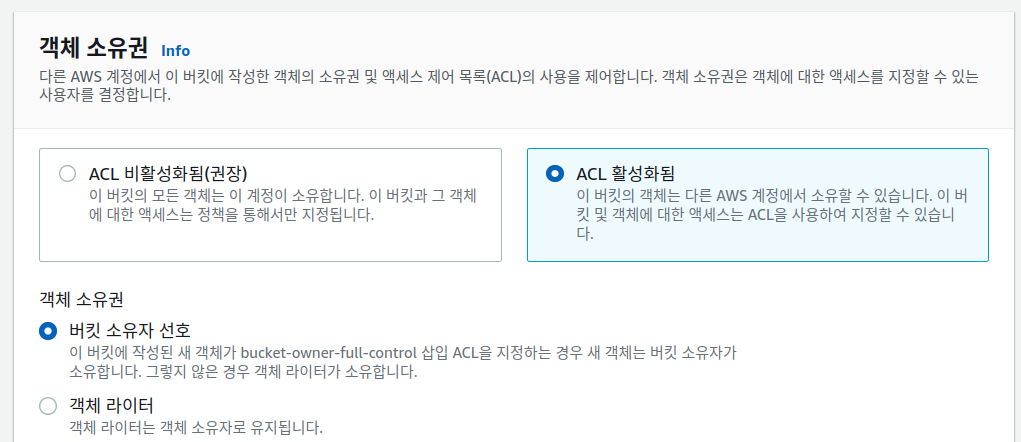 ACL 을 활성화하면 다른 AWS 계정에서 접근 및 소유가 가능하다. 테스트 용 정적 페이지 제공을 위해서 ACL 를 활성화시켰다.