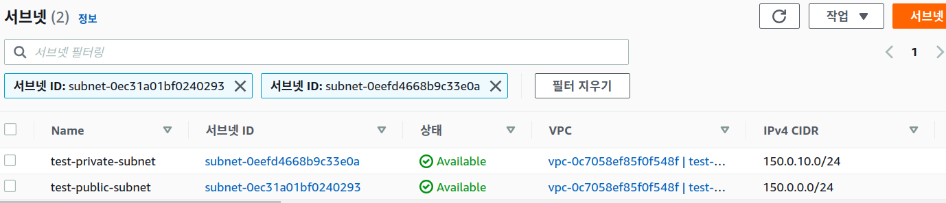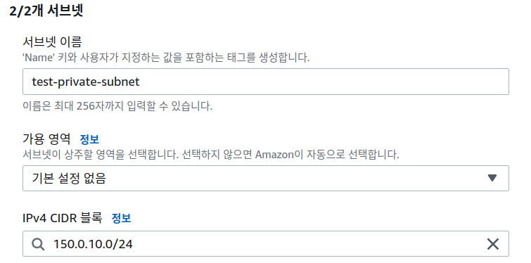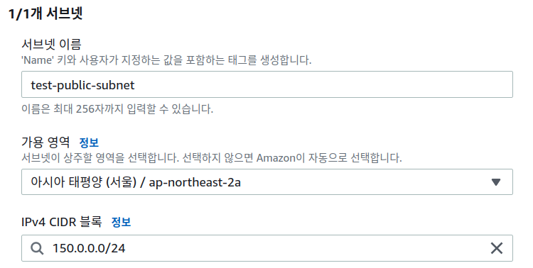 위에서 만든 test-vpc 내부에 서브넷을 생성할 것이므로, test-vpc를 선택한다.
