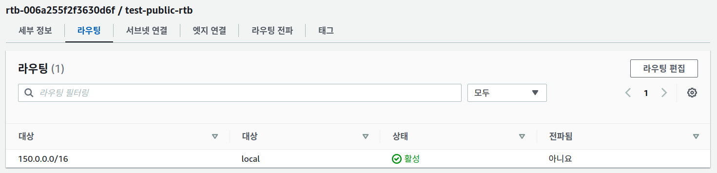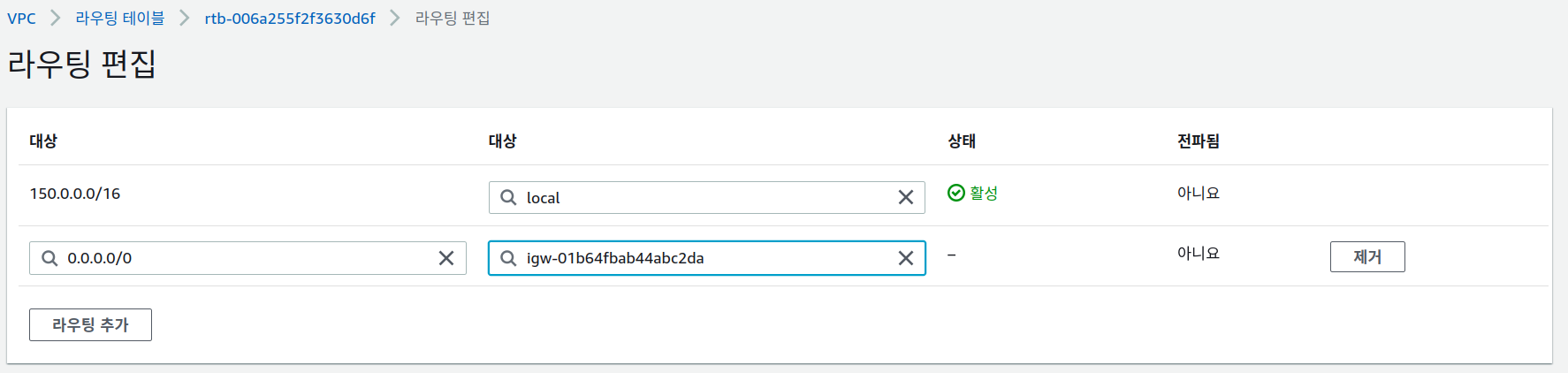 public subnet 용 라우팅 테이블이다. 라우팅 편집을 누르고, 위에서 생성한 인터넷 게이트웨이를 추가해주어야 한다.