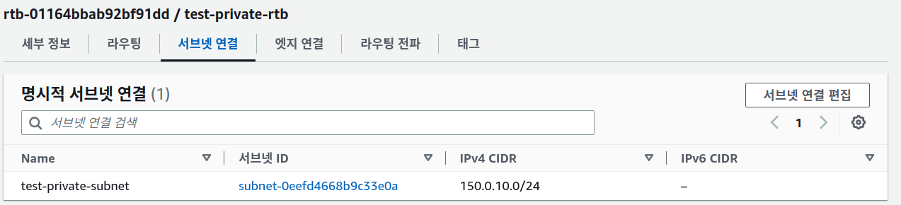 또한 이 라우팅 테이블에 서브넷 연결이 안되어 있다면, 서브넷 연결 편집을 해주어야 한다. test-private-linux 인스턴스가 사용중인 private subnet과 연결해주어야 한다.