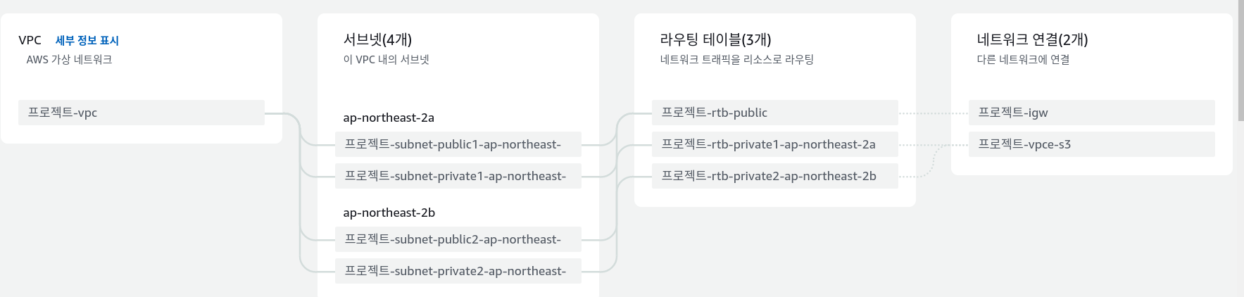 VPC 구성 -> 서브넷 생성하기 -> 인터넷 게이트웨이 생성 -> VPC 인터넷 게이트웨이 연결하기 -> 라우팅 테이블 생성 -> 라우팅 테이블과 서브넷 연결하기