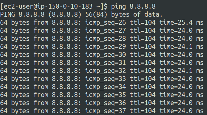ping test를 시도하면 외부에는 패킷이 안날아가는.. 즉 외부와 통신은 되지 않는 것을 확인할 수 있다 !! 프라이빗 서브넷을 사용하기 때문이다.