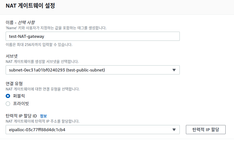 NAT 게이트웨이를 생성할 때, public subnet을 선택해야 한다. 그리고 연결 유형은 퍼블릭으로 해준다. 이렇게 해야 VPC의 외부와 통신할 연결 통로를 구성할 수 있다. 또한 이 게이트웨이의 주소가 필요하므로 탄력적 IP 할당 버튼을 눌러서, IP를 부여받는다.