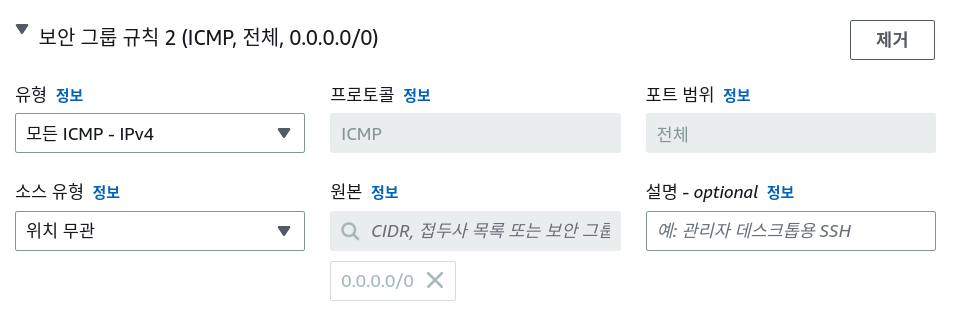 나중에 ping 명령어로 외부와 통신이 되는지 확인할 것이므로, ICMP 보안 그룹 규칙을 하나 더 추가해주었다.