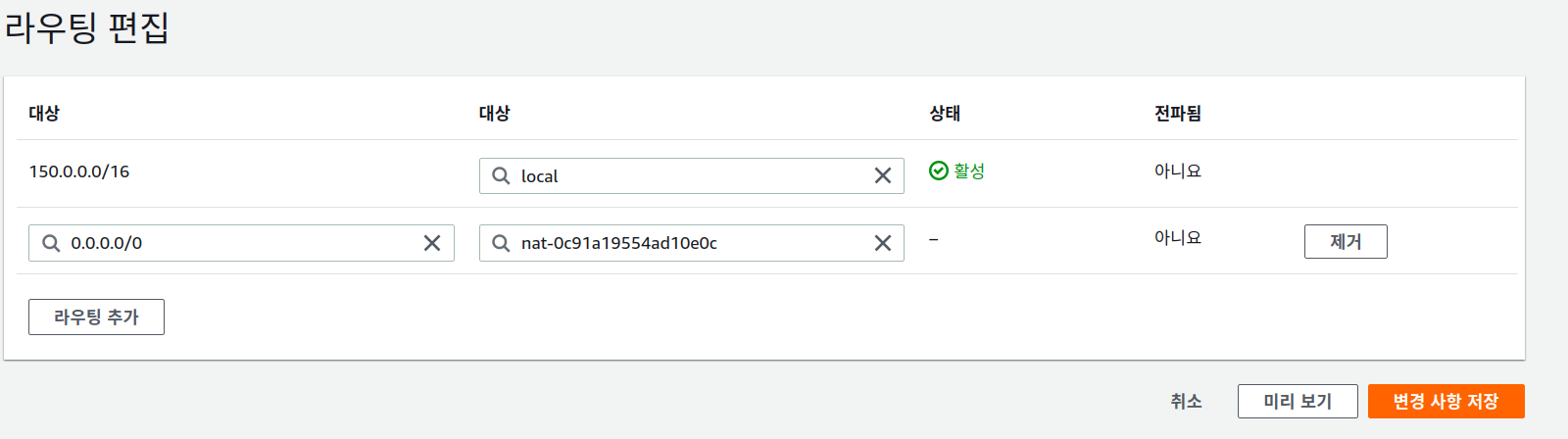 VPC > 라우팅 테이블 로 이동해서, test-private-rtb 라고 이전에 생성했던 프라이빗 서브넷에 대한 라우팅 테이블의 내용을 수정한다. 편집하기를 누르고, 이전에 생성한 NAT Gateway를 선택한다.