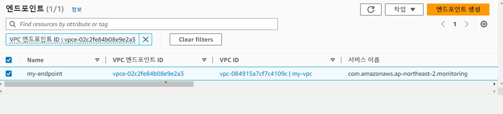 AWS VPC > 엔드포인트 선택 > 엔드포인트 생성 버튼 클릭