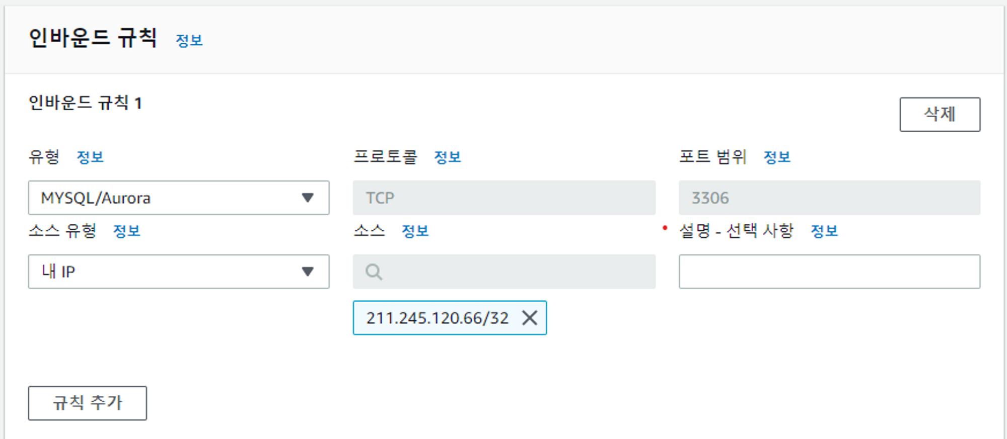 RDS 보안그룹에 인바운드 규칙은 다음과 같이 추가되어야 한다. (필요에 따라 내 IP를 선택하거나 모든 트래픽을 선택하면 될 것이다. )