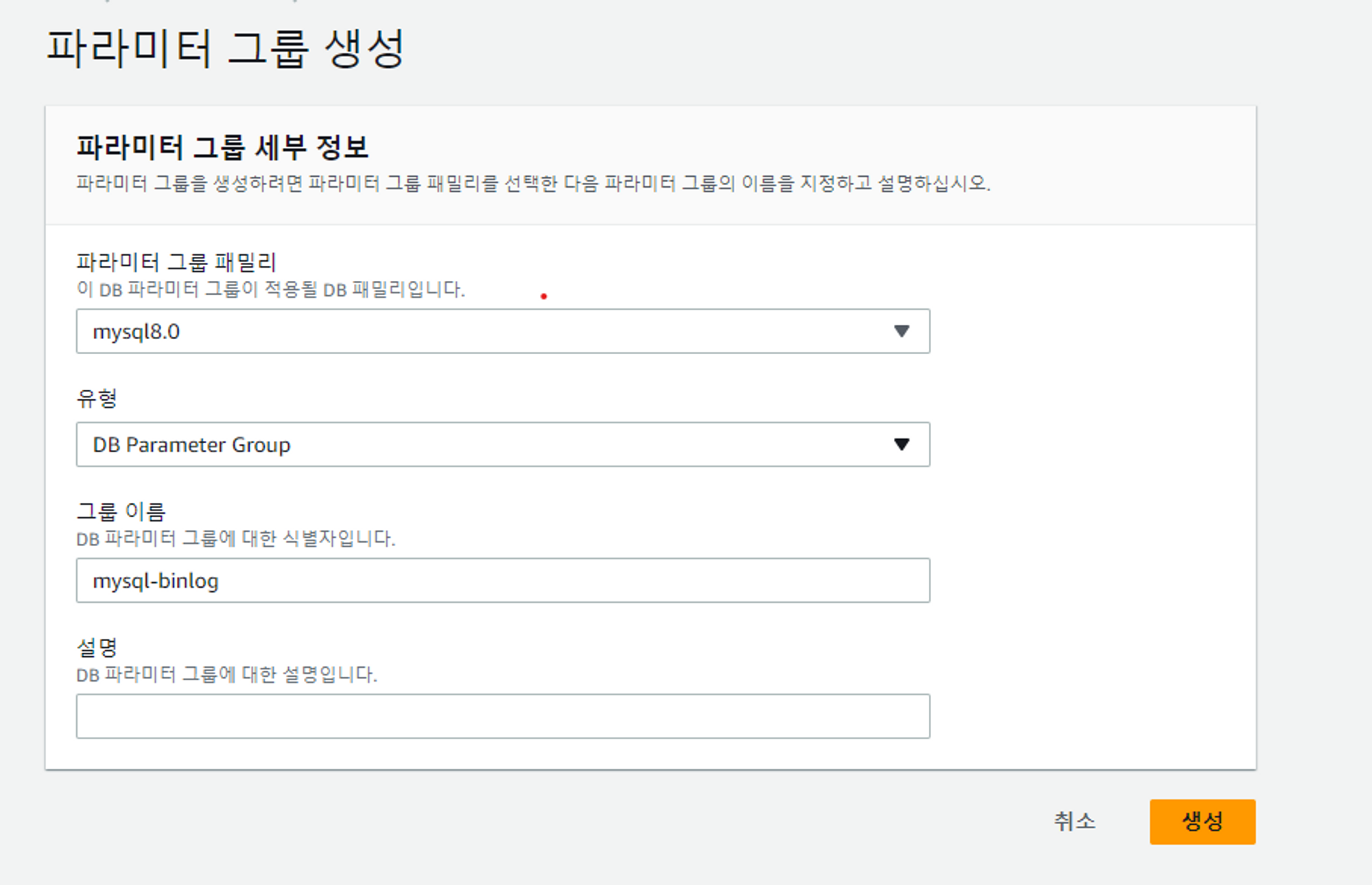 5. 파라미터 설정에서 binlog_row_image 를 full 로 변경
