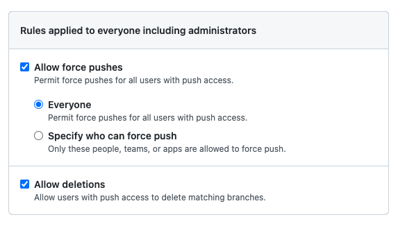 구글링 해보니까 branch protect 정책을 설정하지 않아서 생긴 문제라고 한다 Git에 새로 생긴 기능이려나..?