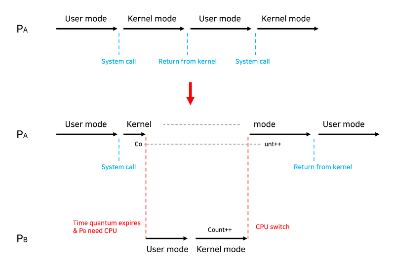 해결 방법 : 할당시간이 끝나는 시점이 Kernel Mode 에서 수행중이라면, CPU 를 선점하지 않는다. 커널 모드에서 사용자 모드로 돌아갈 때 선점한다.