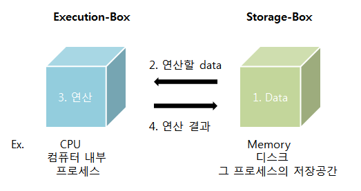 데이터가 저장되어 있는 위치에서 읽어와서 연산을 함. 연산결과를 다시 원래 위치에 저장.