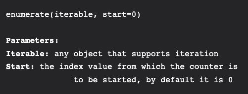 enumerate 의 파라미터는 iterable한 원소와 index이다. index는 생략가능하며, 지정해주지 않을 경우에 0부터 시작한다.