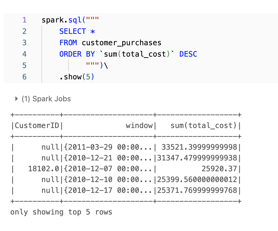 CustomerId로 Group By 를 한 것에 대해 각각의 customer 가 소비한 total_cost 를 집계하는 코드이다. 이 연산 또한 지연 연산이므로 스트리밍 액션을 호출해야 한다