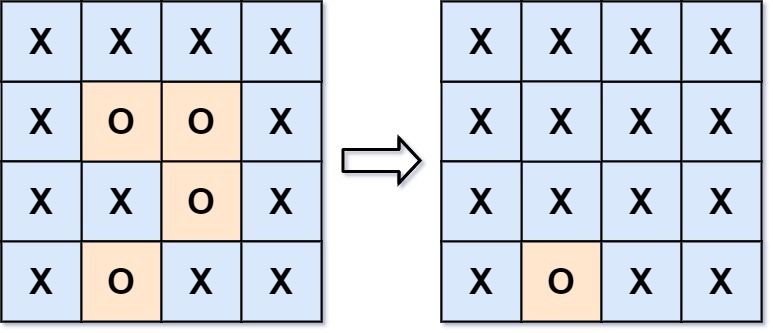 - 가장자리에 있는 "O" 를 찾아서, "O"와 인접한 칸들까지 BFS로 찾아서 island 라는 집합에서 빼준다.