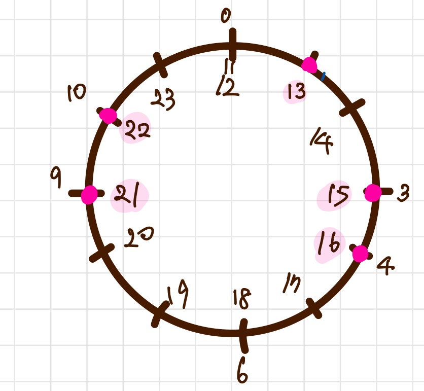원형일 경우 0 지점을 넘어갈때 계산이 불편하므로, 이를 일직선 상에 놓는다. 각각의 지점에 n 만큼을 더해주면 한바퀴 돈 다음의 position을 구할 수 있다.