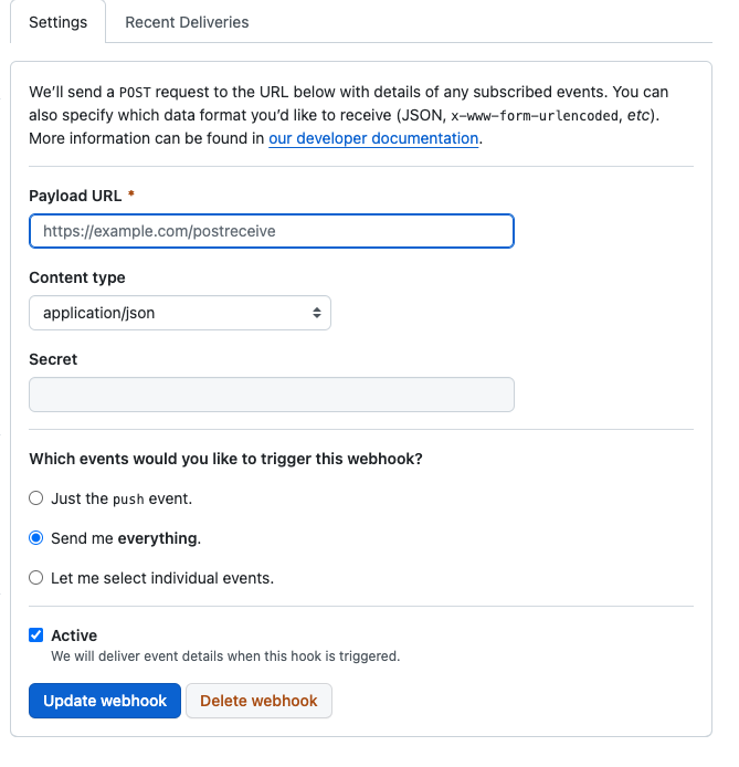 Add Webhook 을 선택한 후, URL 을 붙여넣는다. 여기서 URL의 마지막에 /github 을 반드시 붙여주어야 한다.