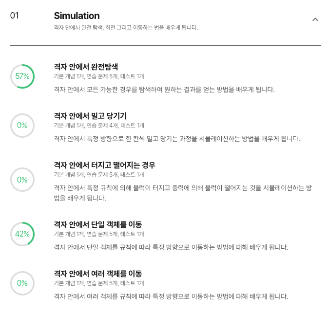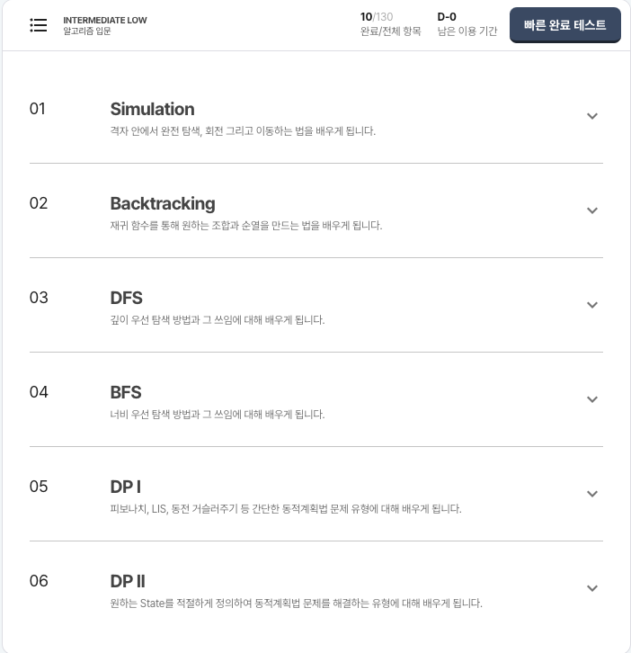 알고리즘 입문 커리큘럼을 선택하면 유형별로 문제를 풀 수 있습니다. 제가 채우고 싶은 시뮬레이션, 백트래킹, DFS, BFS 등의 유형이 있었습니다.