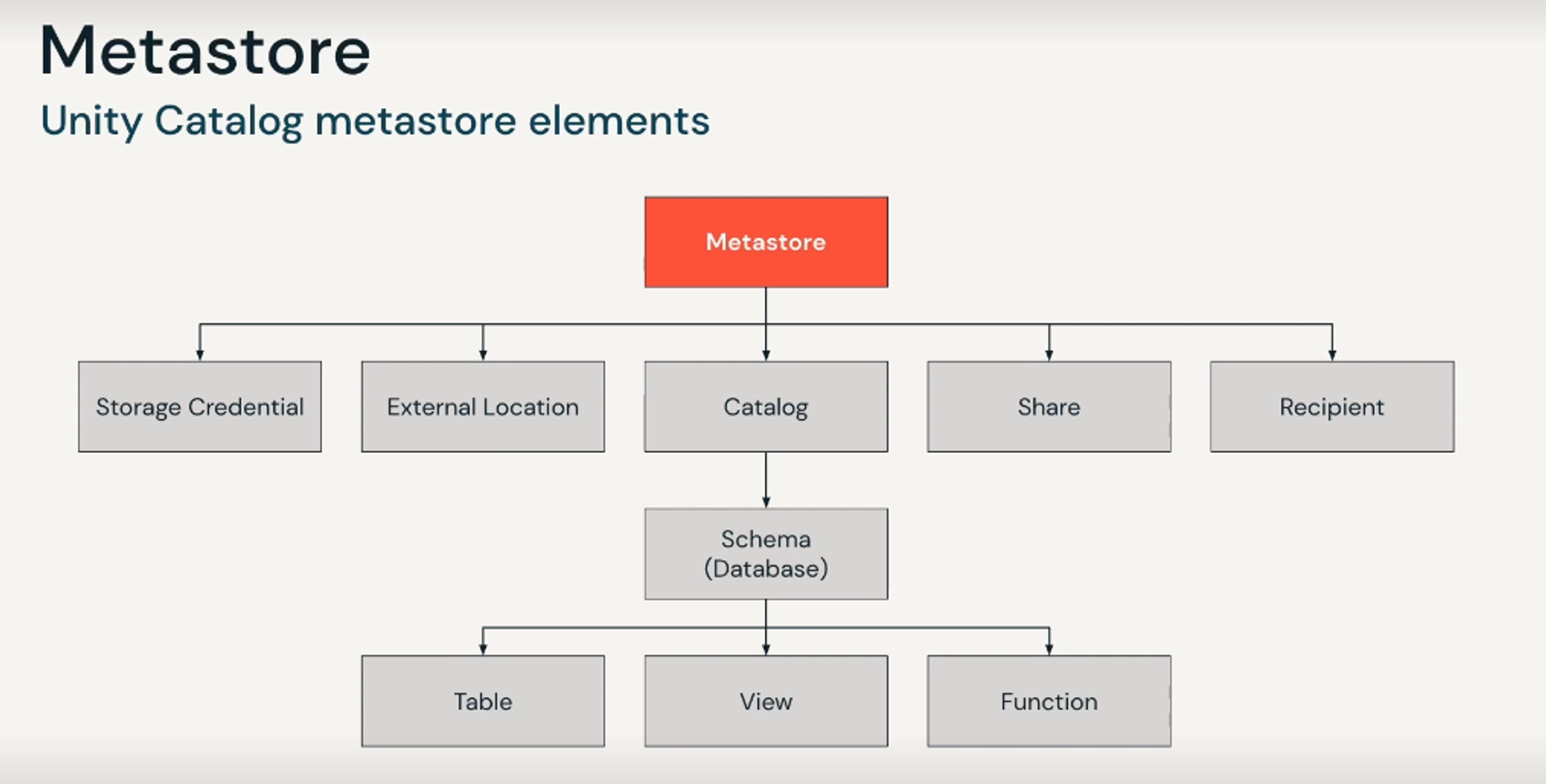 참고로 Unity Catalog 사용을 위한 Metastore 는 Databricks Account Console 당 한 리전에 한개만 생성할 수 있다. Metastore 의 계층 구조를 살펴보면 좀 더 이해가 쉽다.
