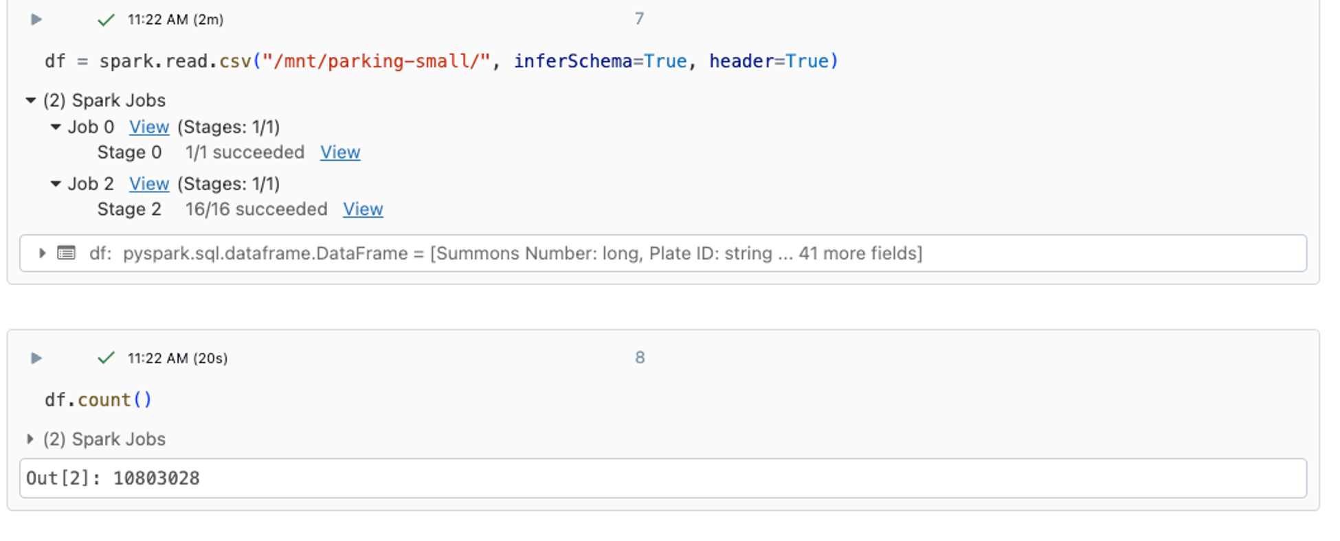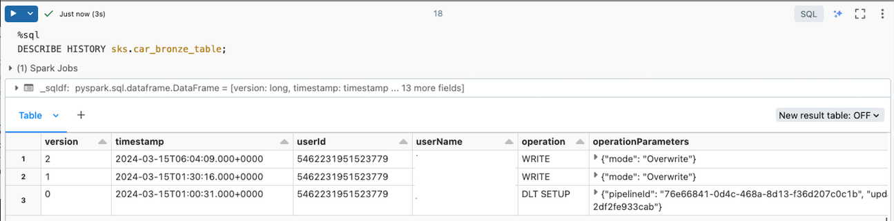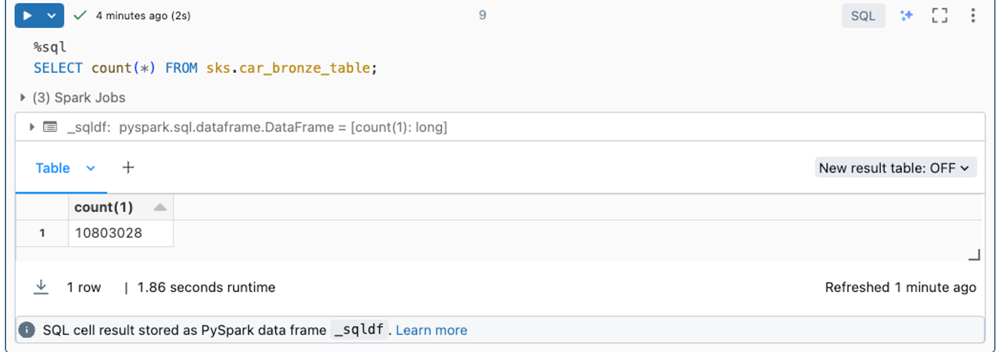 그후 위에서 생성한 car_bronze_table 의 row 수를 count 하면 아래와 같다. 이로써 Delta Live Table을 통해 모든 데이터가 source 경로로부터 적재가 된 것을 확인할 수 있다.