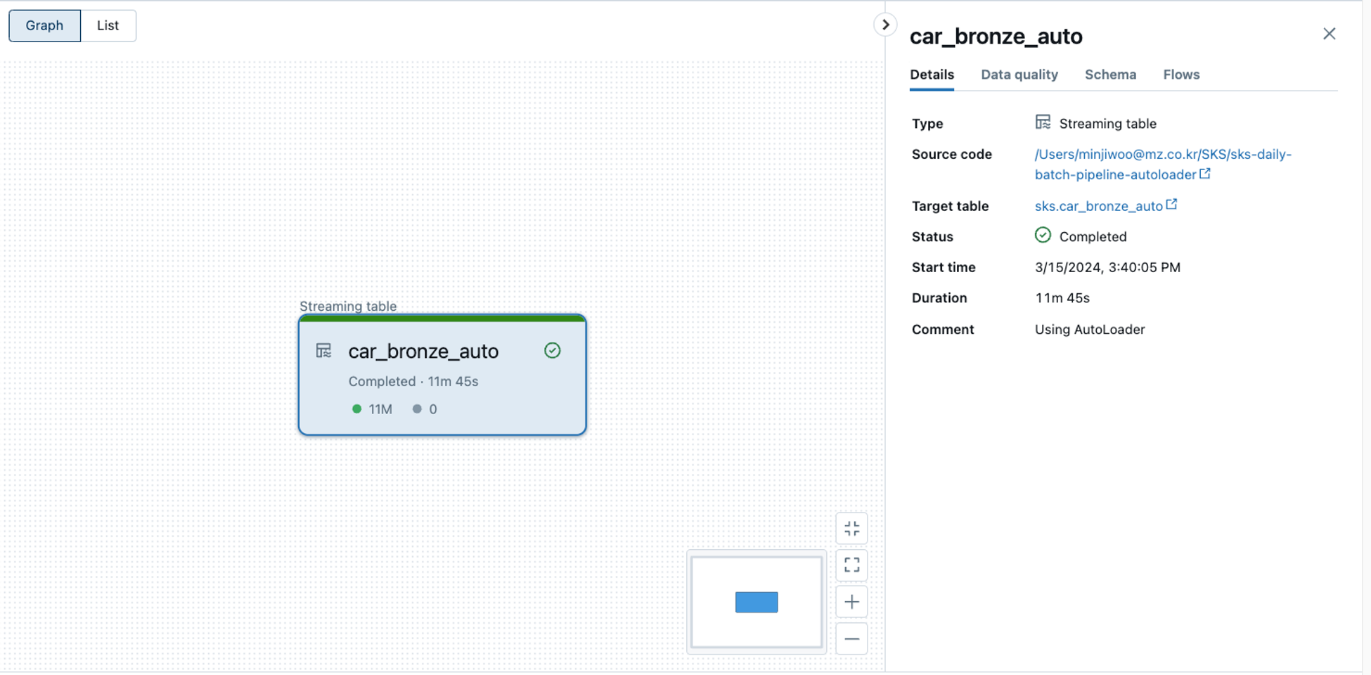 위의 Delta Live Table 파이프라인을 실행한 결과는 아래와 같다. 파이프라인을 실행 시키는 모드는 trigger 와 continuous 로 2가지가 있으며 trigger 는 일회성으로 동작하고 , continuous는 계속해서 인스턴스가 떠있으며 스트리밍 데이터를 계속 받아오는 방식이다. 아래 결과의 경우 trigger 방식으로 실행하였다.