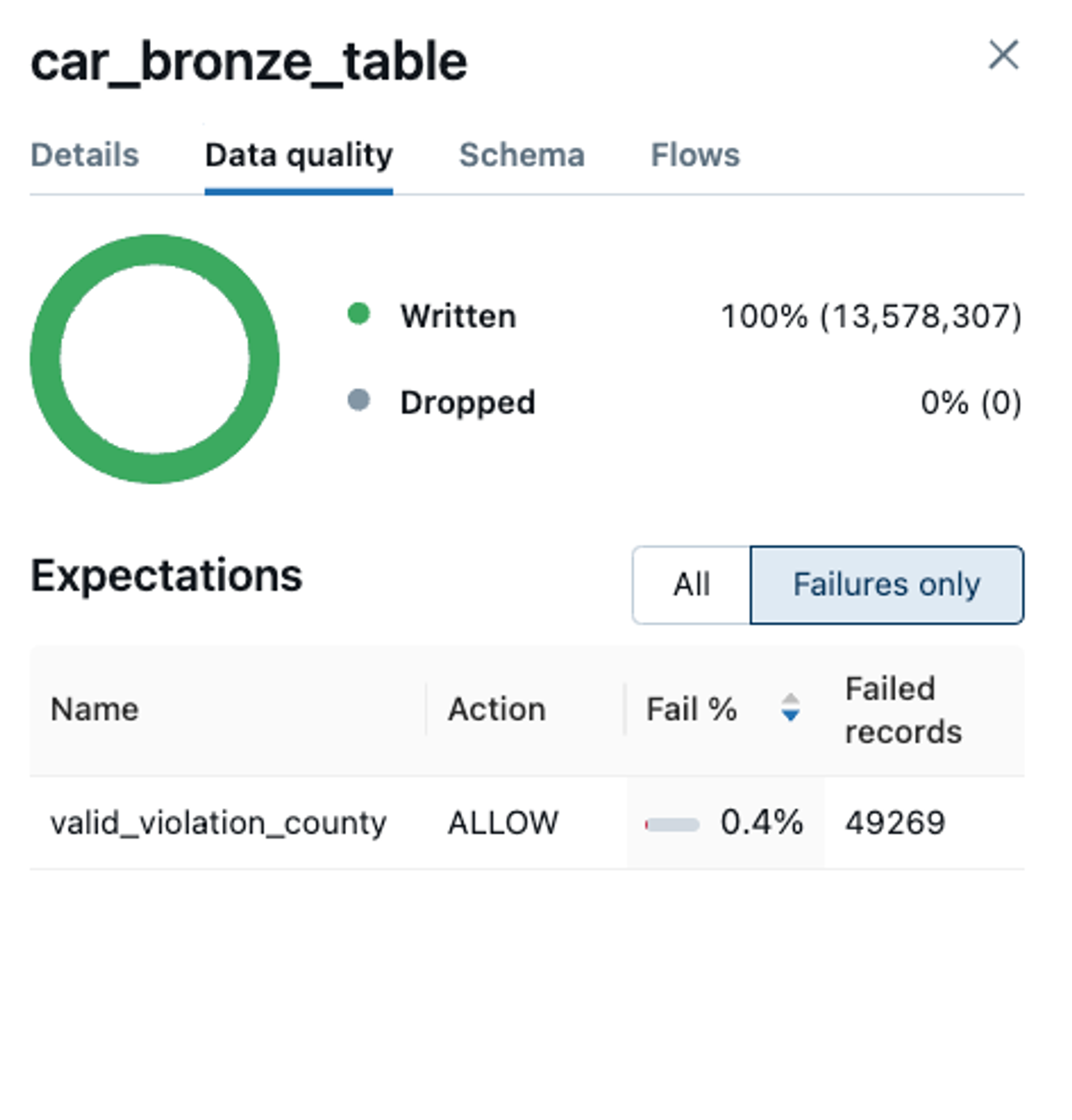 Delta Live Table 에서 조건들을 주고, 데이터 퀄리티를 체크한 것을 아래와 같이 모니터링 할 수 있다.