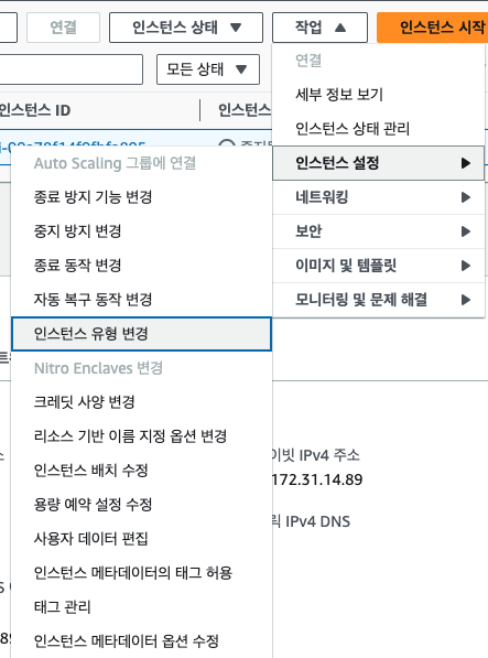 사용중인 인스턴스를 '중지' (절대 종료하면 안된다 인스턴스가 삭제됨) 한 후에, 인스턴스 설정 > 인스턴스 유형 변경을 선택한다.