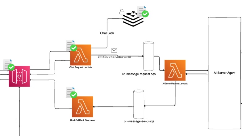 초기에는 lambda 함수간 직접적으로 메세지를 주고받았으나, SQS를 도입한 이후 위와 같이 아키텍처가 확장되었다. kakao chatbot 을 통해, 사용자가 질문 (요청)을 하면, 이 요청에 대해서 Chat Request Lambda에서 처리한다. Chat Request Lambda 는 chat에 식별자를 부여한 후, on-message-request-sqs에 전송한다. Redis에는 해당 chat 이 처리중임을 알리기 위해서 lock 상태로 변환 한 후 저장한다.