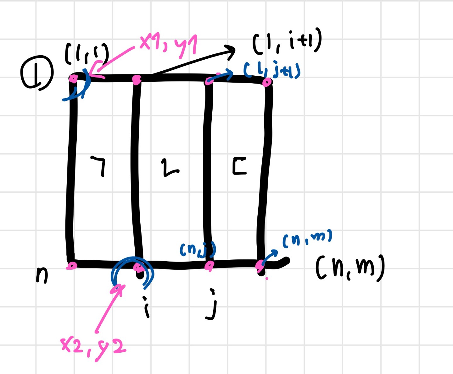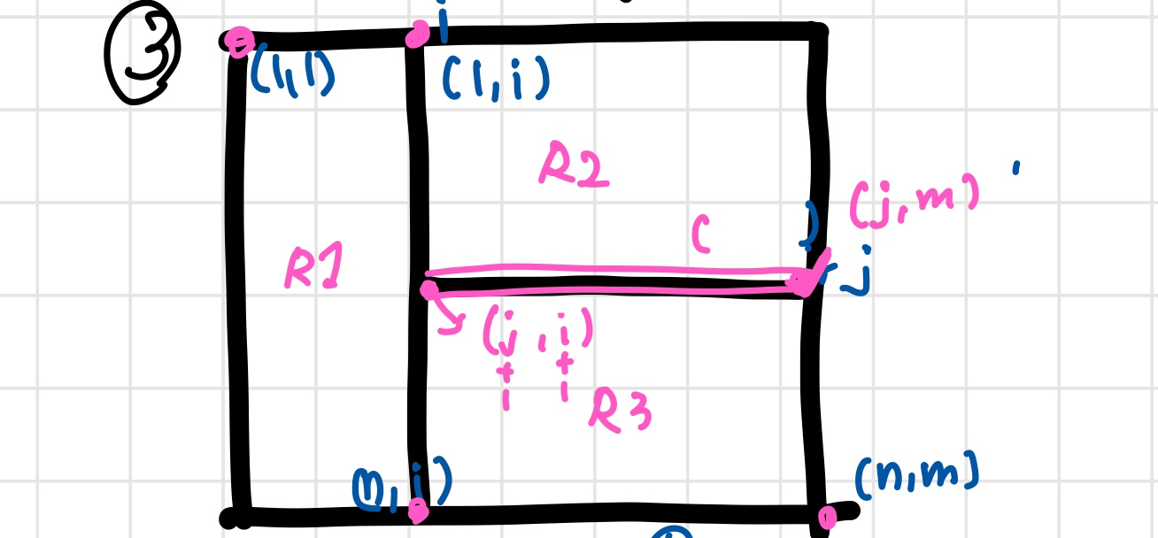 예를 들어서, 6)의 R3에서 좌측 상단 점 (x1, y1) 는 (1, j+1)이다. 왜냐하면 R1의 가장 마지막 좌표가 j 였으니까, 실질적으로 한칸을 차지하므로 +1을 해줘야 한다