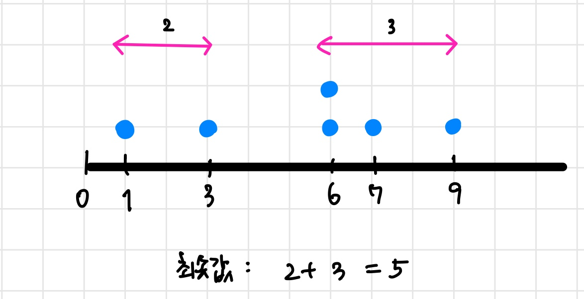 즉 여기서 거리 3 을 제거하고 연결을 끊는다고 생각하면, 나머지 거리의 차들을 다 더하면 이것이 최소값이 된다.