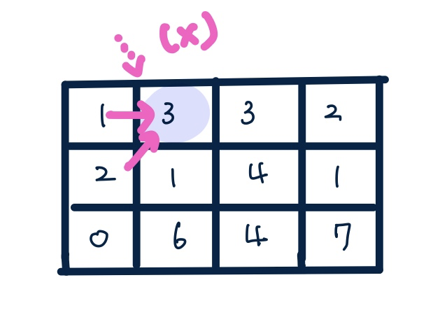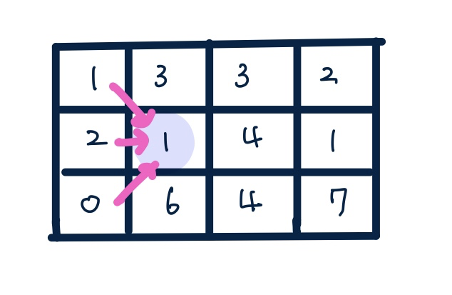 이를 현재 내 위치인 dp[i][j]에서 보면 왼쪽 위, 왼쪽, 왼쪽아래에서 내 위치로 오는 3 가지 경우가 있다는 의미이다