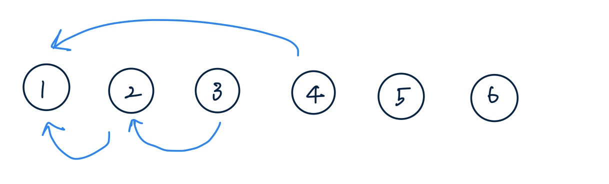 특정 원소가 속한 집합을 찾으려면 루트노드를 확인하면 됩니다 예를 들어서 위의 예시에서는 4가 속한 집합은 루트노드가 1인 파란 선들의 집합이고, 6이 속한 집합은 루트노드가 5인 핑크색 집합이 되겠습니다.
